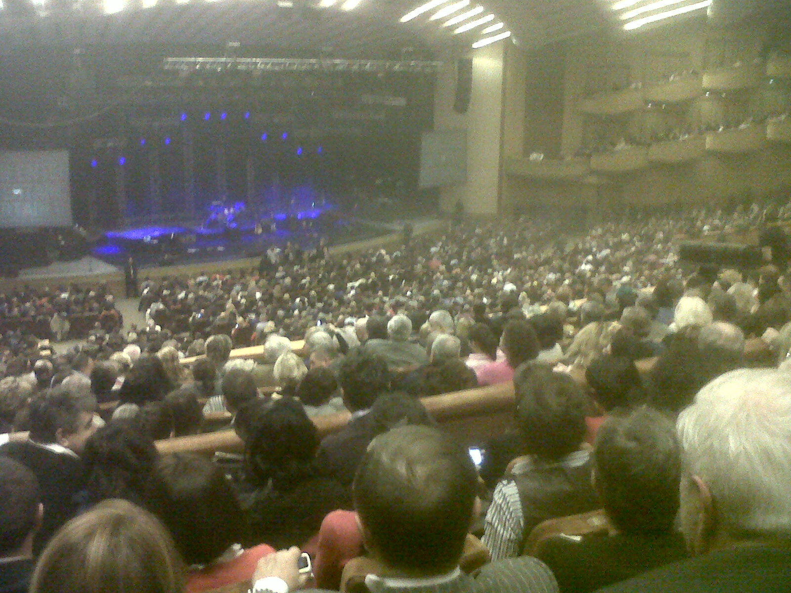 Pentru ca sunt undeva mai sus, la biletele de 200 de RON, pot sa fac o fotografie – cu scena goala si sala plina, asteptand vedeta – si sa ma intreb: Cati ani o avea? Peste 70? E irlandez sau galez? Parca galez, dar nu sunt sigur … Oare-o sa cante din cele vechi, pe care le cantam dansand – sau le dansam cantand, dupa caz?
