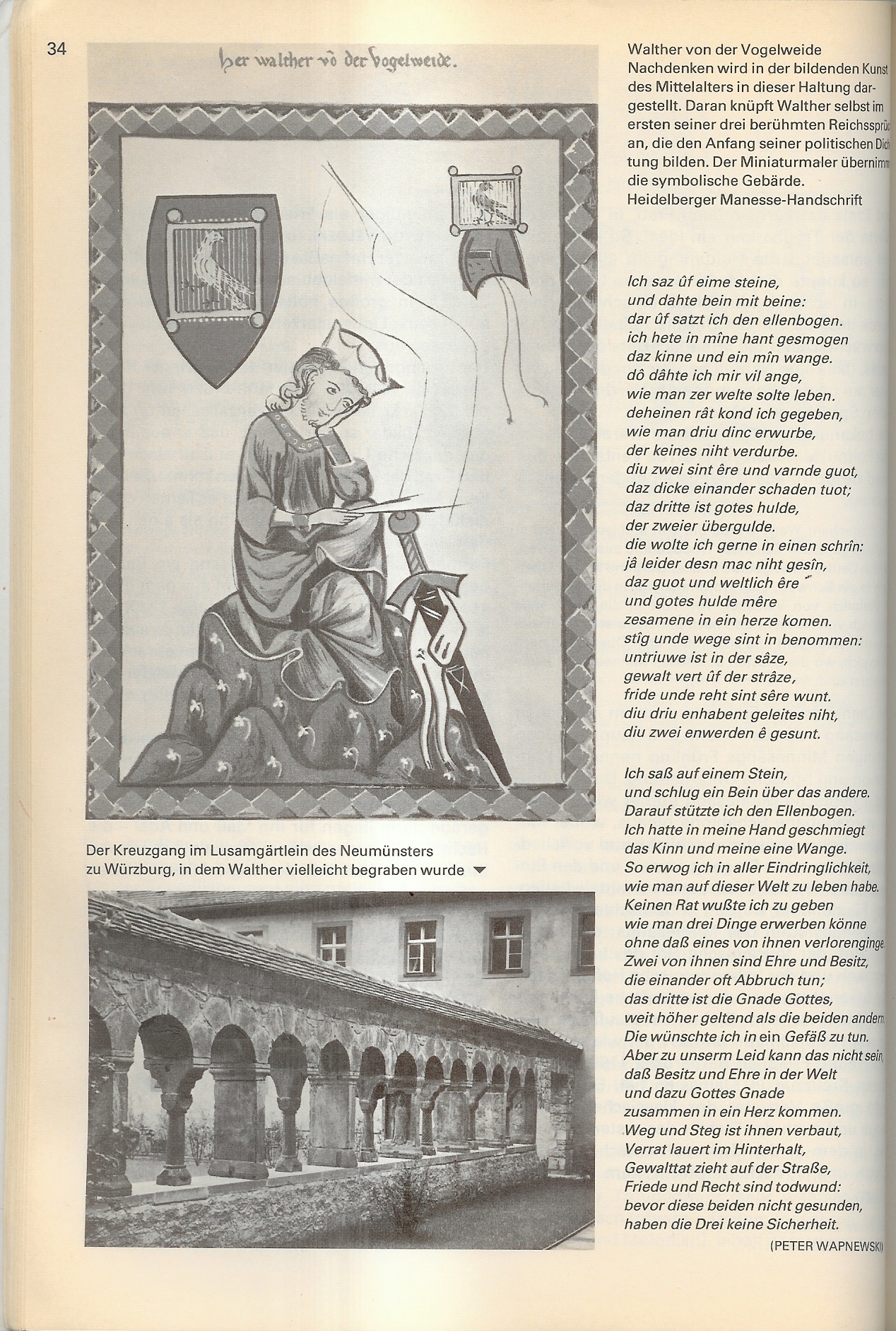 Şi, cum stăteam aşa gândind la infinitul care ni se măreşte şi ce-i de făcut pentru a fi la modă în atari vremuri tranzitorii, iată că descopăr într-o pagină de carte portretul unui vechi prieten: Herr Walther von der Vogelweide, de profesie minnesänger, pe la anul 1200. “Minne” – adică acea dragoste împărtăşită, trăirea care se naşte din consonanţa a două inimi care bat în acelaşi ritm. Iar “Sänger” – cântăreţ, bard. Domnul Walther a fost catalogat în istorie drept cântăreţ al trăirii armonioase, mai pe scurt: minnesänger….