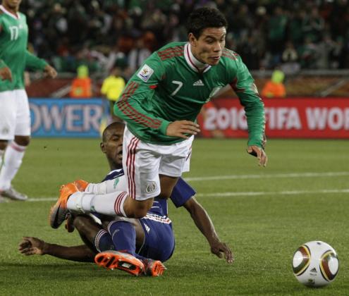 Vela şi Franco trag la poartă să rupă plasa, dar mingea trece peste. Operatorii insistă pe Arsene Wenger – cel care comentează pentru televiziunea franceză acest meci important. Din păcate, elevul lui de la Arsenal se accidentează – Carlos Vela este schimbat în minutul 31 cu Pablo (Pablito!) Barrera… Din păcate pentru Wenger, căci sângele proaspăt aruncat în luptă se simte imediat. Chiar înainte de finalul primei reprize, o şarjă de cavalerie a înaintaşilor mexicani pare determinată să ajungă cu mingea în poartă: înţeleptul Toulalan acceptă mai degrabă umilinţa unui cartonaş galben decât un gol înainte de intrarea la vestiar…