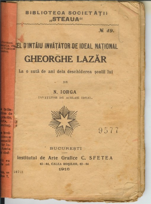 Biblioteca Societatii “Steaua” publica in 1916, anul intrarii Romaniei in primul Razboi Mondial, un omagiu “celui dintai invatator de ideal national – Gheorghe Lazar – la o suta de ani de la deschiderea scolii lui”: carticica este semnata de Nicolae Iorga, “invatator de acelasi ideal”… Intr-o analiza a esentialului, pe care il descrie cu pana usoara – stiind ca va fi citit de masse -, Iorga reconstruieste atmosfera din Principate – dupa un veac de grecizare fanariota a fiintei poporului nostru.